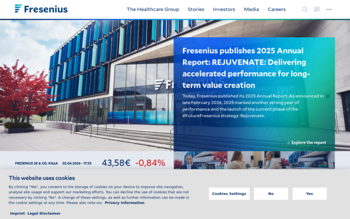 Fresenius 2026-04-05 Posted in Bio & Healthcare 0 Likes 8 Views Share: XFacebookPinterestRedditVKDiggLinkedinMix Source: https://www.fresenius.com Captured on: 2026-03-31 Description: No description available. Related Articles 0 4 Roivant Sciences 0 8 Alnylam Pharmaceuticals 0 6 BioNTech 0 6 Baxter