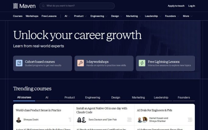 Description: Live courses with real-world experts in AI, Product, Leadership, Design, Data & engineering, Marketing & sales, and Business & finance.